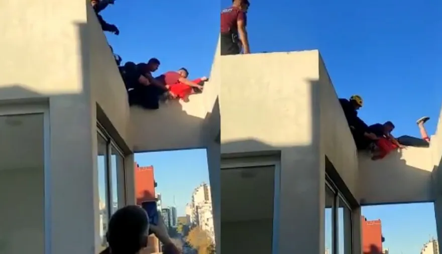 En otro de los videos, que fue grabada por un celular desde la calle, se observa a esta persona con las piernas colgando desde el borde del edificio, siendo sujetada por los efectivos, que intentaban que no se cayera.