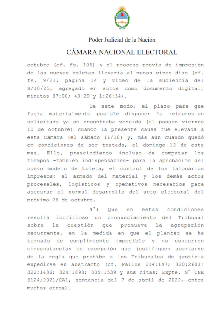 El fallo recuerda que el 8 de octubre se habían recibido los 38.760 talonarios de boletas y que el control del material estaba prácticamente terminado. Según el informe del Correo Oficial, la fecha límite para iniciar la distribución era el 16 de octubre, y el proceso de impresión de nuevas boletas requería al menos cinco días hábiles. En consecuencia, el plazo efectivo para realizar el cambio había vencido el 10 de octubre, antes de que la causa llegara al tribunal.
