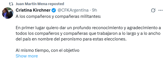 La misiva, difundida a través de sus redes sociales, calificó como un “error político” la decisión del mandatario provincial de desdoblar las elecciones bonaerenses de las nacionales, al considerar que esa estrategia fragmentó el voto peronista y facilitó la victoria opositora.