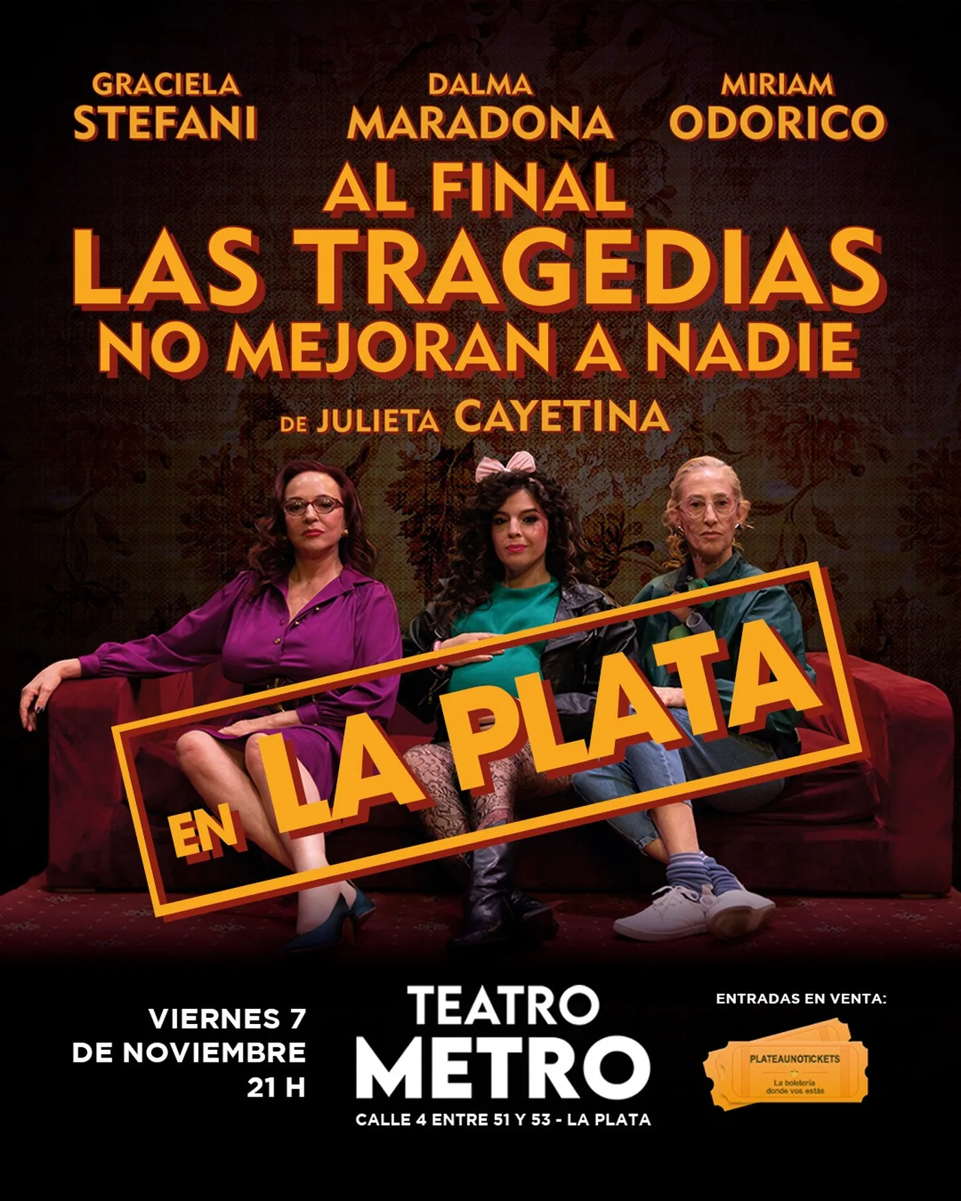 Mientras tanto, el Teatro Metro se transforma en un espacio para la palabra y la interpretación, con Dalma Maradona protagonizando la obra Al final las tragedias no mejoran a nadie, una propuesta teatral que apuesta por la reflexión y la contradicción atravesada por el humor.