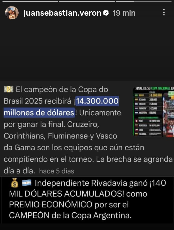 En los últimos días, Juan Sebastián Verón usó sus redes sociales para lanzar una fuerte crítica hacia la Asociación del Fútbol Argentino (AFA). El presidente de Estudiantes de La Plata publicó una historia de Instagram en la que comparó lo que recibió el campeón de la Copa Argentina con lo que obtiene el campeón de la Copa do Brasil: “El campeón de la Copa do Brasil 2025 recibirá 14.3 millones de dólares”, indicó la captura, mientras que el campeón argentino ganó una fracción de esa cifra.
