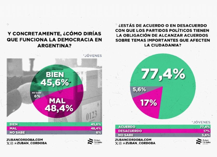 El relevamiento muestra que siete de cada diez jóvenes sostienen que la democracia es el mejor sistema de gobierno. No obstante, casi la mitad considera que funciona mal en la Argentina actual y más de un tercio opina que no distribuye la riqueza de forma equitativa.