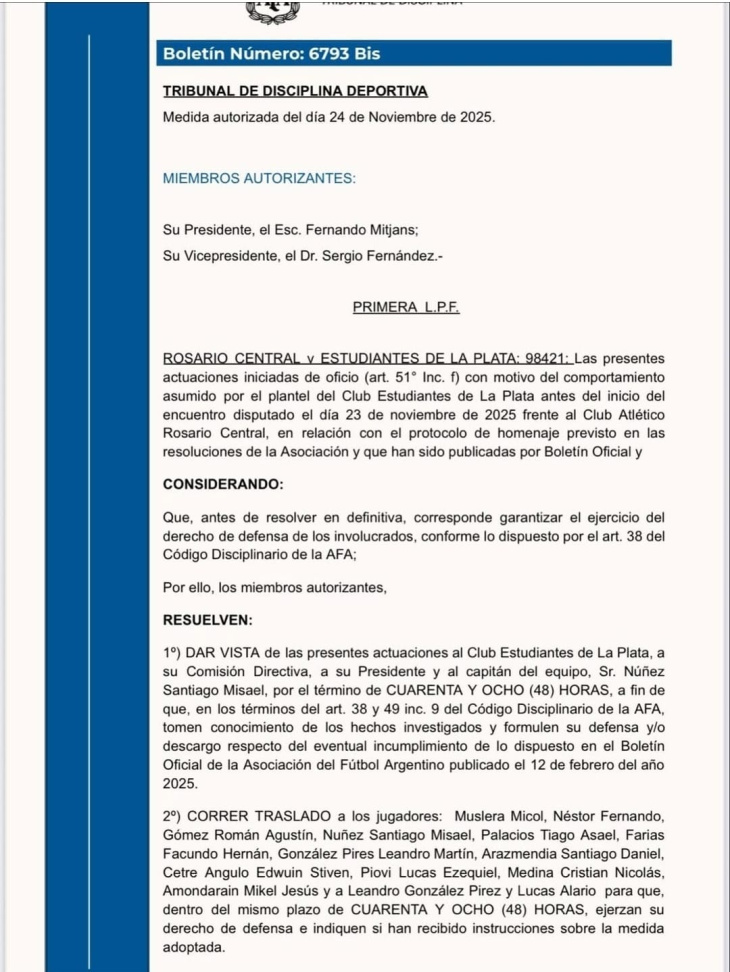 La Asociación del Fútbol Argentino avanzó oficialmente con la investigación sobre el “pasillo de espaldas” realizado por jugadores de Estudiantes de La Plata durante el ingreso de Rosario Central el pasado 23 de noviembre. La medida quedó expresada en el Boletín N.º 6793 Bis del Tribunal de Disciplina Deportiva, autorizado el 24 de noviembre de 2025.