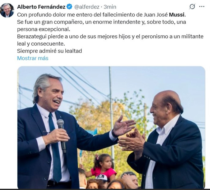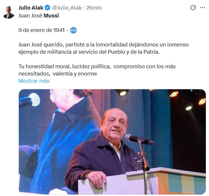 A sus 84 años, falleció este mediodía el intendente de Berazategui, Juan José Mussi. Estaba internado desde la semana pasada en el Hospital El Cruce de Florencio Varela.