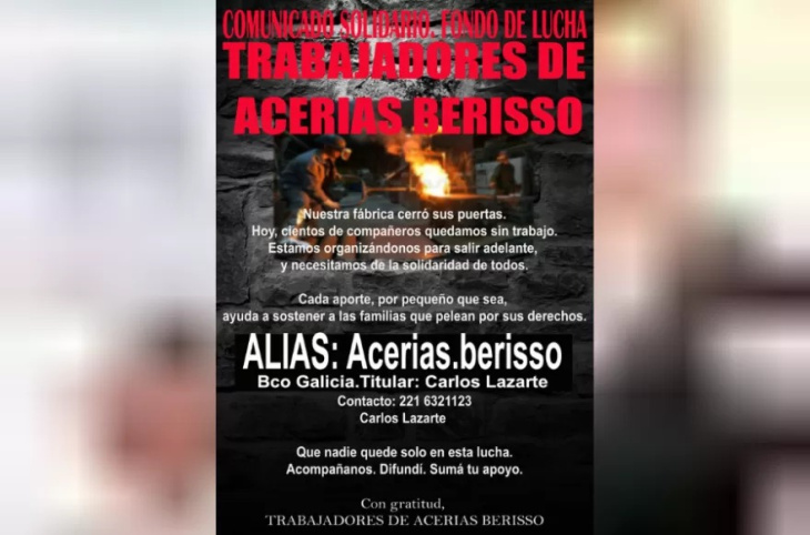 Con la continuidad económica de muchas familias en riesgo, los operarios anunciaron la creación de un fondo solidario para sostener a quienes quedaron sin ingresos. A través de aportes voluntarios, buscan acompañar a los despedidos mientras avanza el reclamo sindical. Las contribuciones pueden realizarse al alias Acerias.berisso del Banco Galicia, a nombre de Carlos Lazarte.