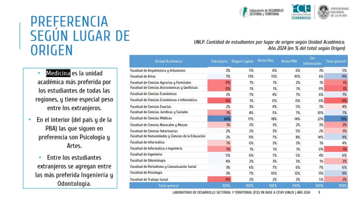 En paralelo, el estudio confirma que la UNLP mantiene un fuerte anclaje territorial. El 90% de los estudiantes argentinos proviene de la provincia de Buenos Aires, principalmente de La Plata, Berisso, Ensenada, Brandsen y Magdalena. Más atrás aparecen Chubut y la Ciudad Autónoma de Buenos Aires, ambas con el 2%.