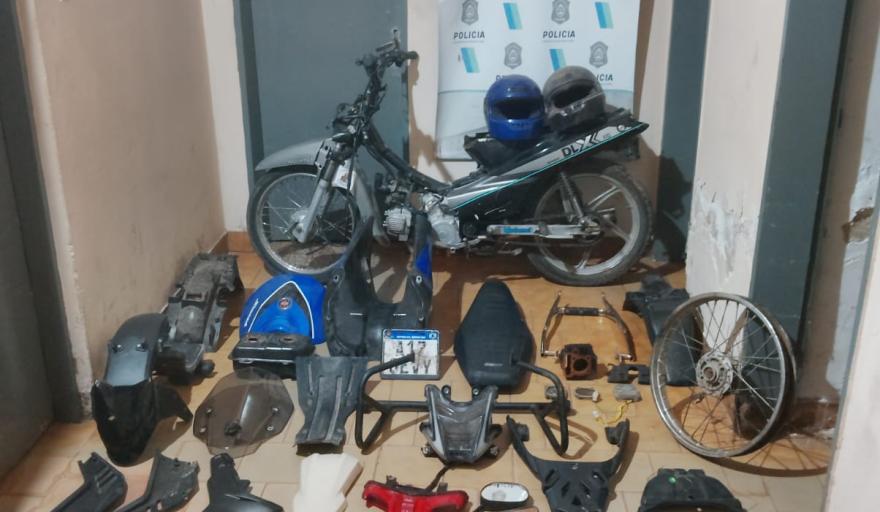 Durante los registros domiciliarios se secuestró una motocicleta Motomel 110 cc con numeración de cuadro suprimida, tres yugas, una chapa patente y una gran cantidad de motopartes, entre ellas plásticos, ópticas, espejos, llantas, tanques de combustible, asientos y piezas de motor.
