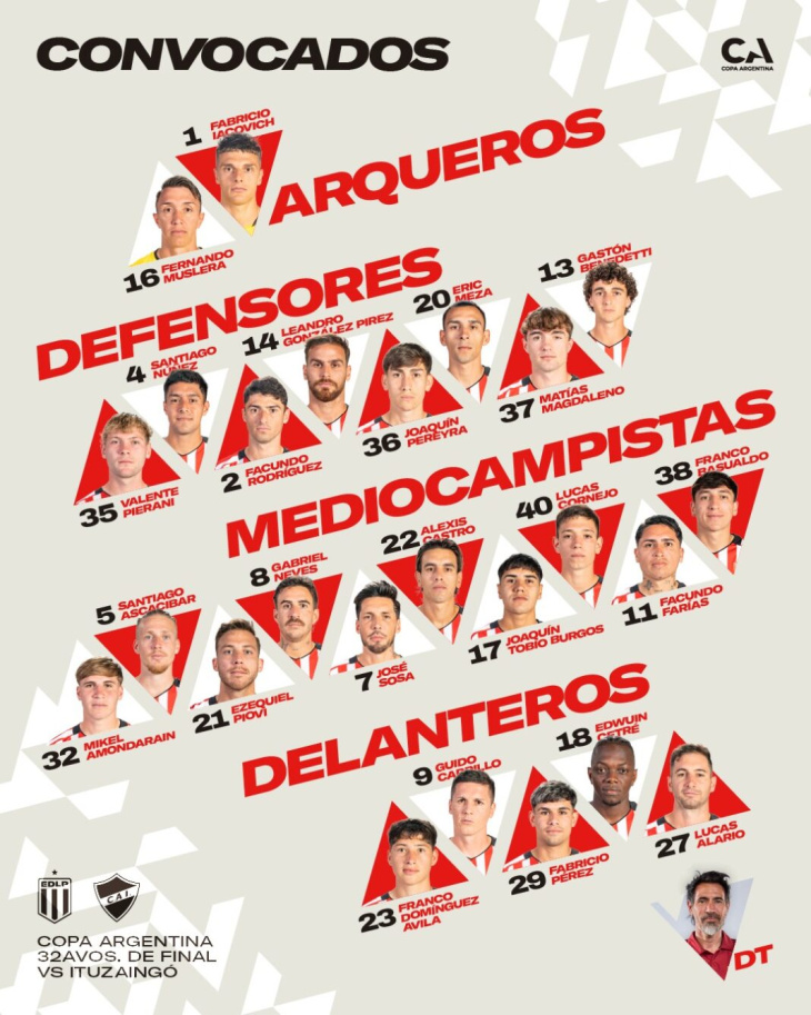 A esta baja se suman otras ausencias obligadas. Tiago Palacios deberá cumplir su sanción tras la roja recibida ante Aldosivi en la edición anterior, mientras que el flamante refuerzo, Adolfo Gaich, no será de la partida por encontrarse aún en proceso de puesta a punto física. Asimismo, Ramiro Funes Mori, quien no es prioridad para el cuerpo técnico y busca club, tampoco integra la delegación.