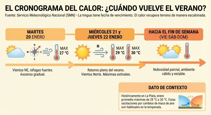 Dato de contexto: Históricamente, en La Plata, las temperaturas de enero promedian máximas de entre 28 °C y 30 °C. Estas oscilaciones son habituales debido a los cambios de masas de aire que moderan el calor antes de un regreso sostenido.