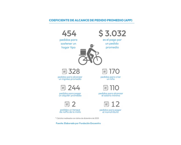 Durante diciembre de 2025, un repartidor de aplicaciones en Argentina tuvo que hacer, en promedio, 454 pedidos para cubrir el costo de la canasta básica total de un hogar tipo de cuatro personas. El dato surge del Índice APP, elaborado por la Fundación Encuentro, que mide cuántos pedidos hacen falta para alcanzar distintos niveles básicos de consumo.
