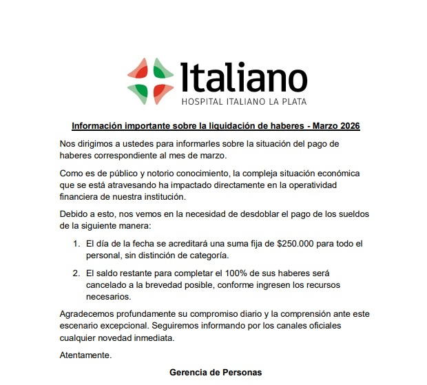 Las autoridades del Hospital Italiano de La Plata comunicaron formalmente que, ante la "compleja situación económica", se ven obligados a desdoblar el pago de los haberes de marzo.