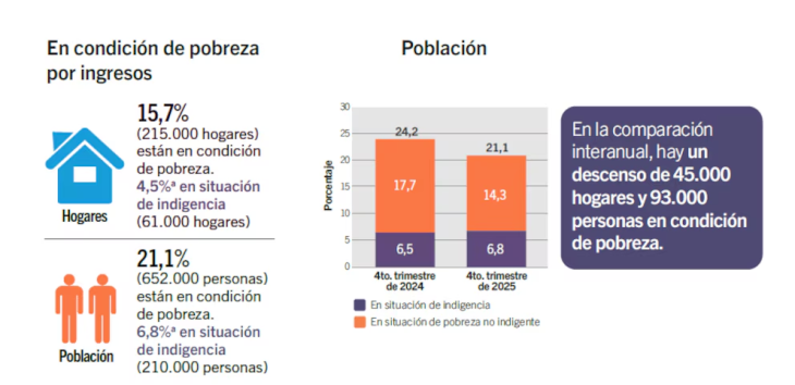 En términos absolutos, unas 652.000 personas vivieron en situación de pobreza al cierre del año, lo que implica 94.000 menos que un año antes. Sin embargo, ese mismo nivel ya se había alcanzado a mitad de 2025, lo que evidencia un estancamiento en la segunda parte del año.