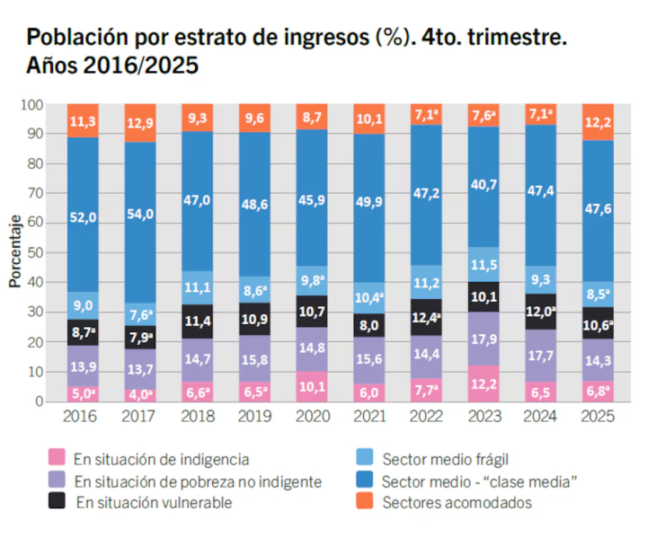 A diferencia de la pobreza general, la indigencia mostró un deterioro. La tasa trepó a 6,8% a fines de 2025, por encima del 6,5% interanual y del 6% registrado en el segundo trimestre.