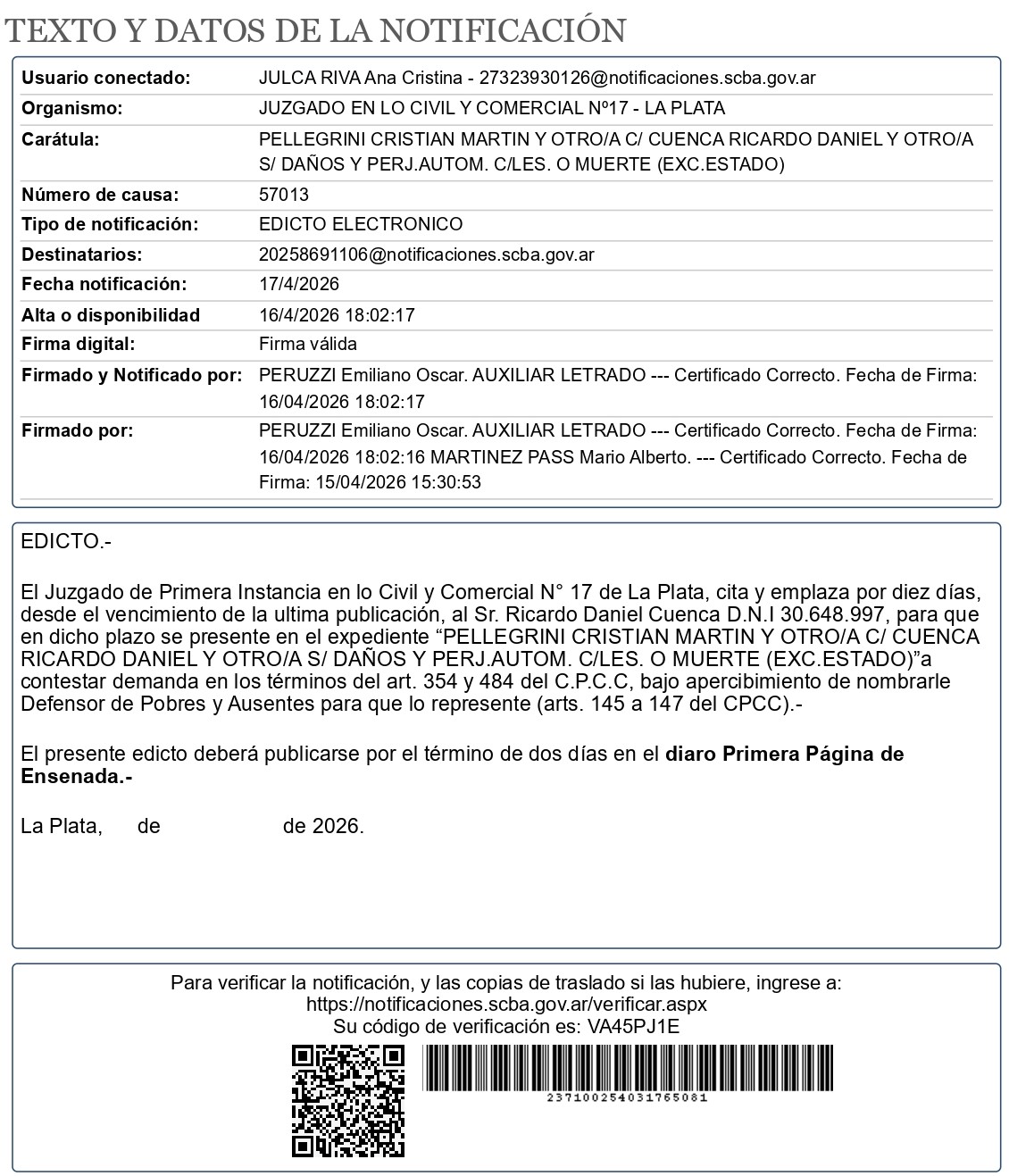 Domicilio: 48 N° 930 Piso 4 Oficina "C"